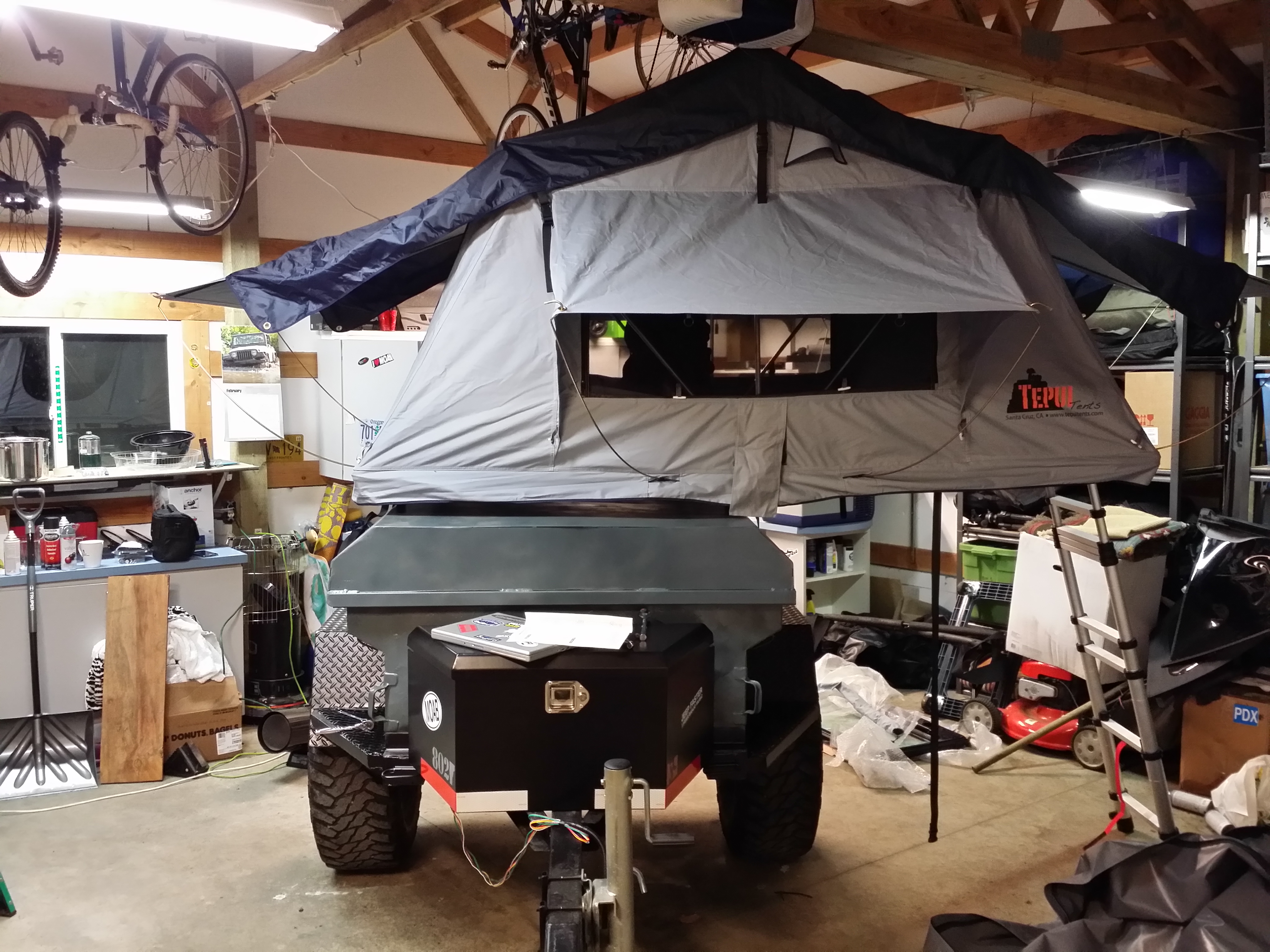 I have been spending every free post-work minute in the garage working on my expedition trailer! Last night I installed a new wiring harness, tongue box, mounted the tent and added cables to the tailgate.