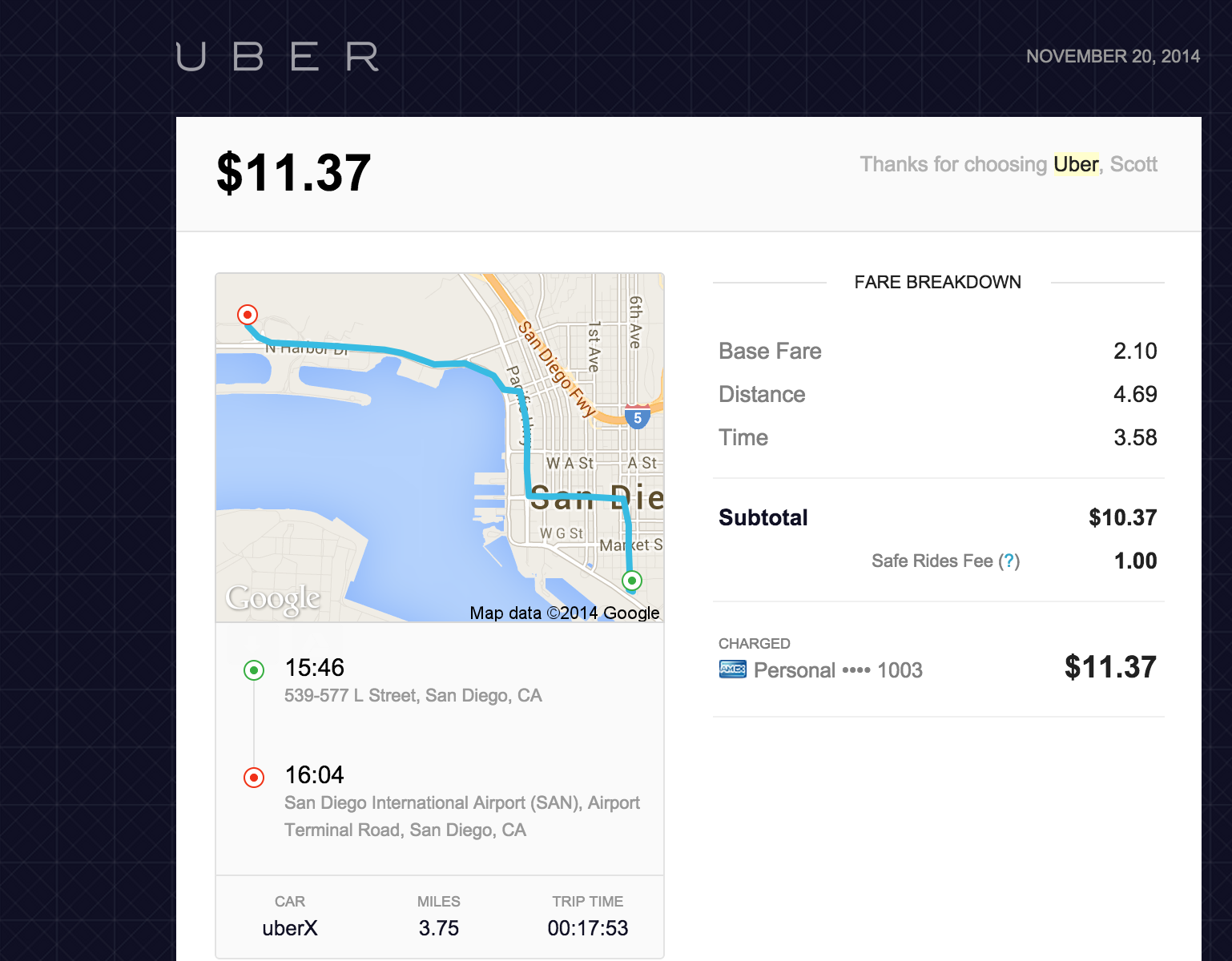 The first time I used Uber was during a business trip to San Diego. I took a cab ride from the airport to the hotel, for a whopping $37 (it was like 4 miles). What is even worse, was the driver’s attitude about accepting my corporate AMEX card (“you don’t have any cash?” he pestered). As he was grumbling about swiping my card, he didn’t even help me with my bags from the trunk. As he sped away, I just about swore off taxis.