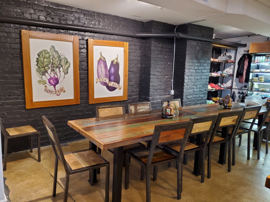 Cashew sits downstairs in a half-basement, half-first floor setting. The space was very well designed – super bright, welcoming, and modern. They have a pretty awesome baked goods selection, as well as a small refrigerated wall with some grab and go items (their own ‘chicken’ salads, Louisville Jerky, craft beers, and others).